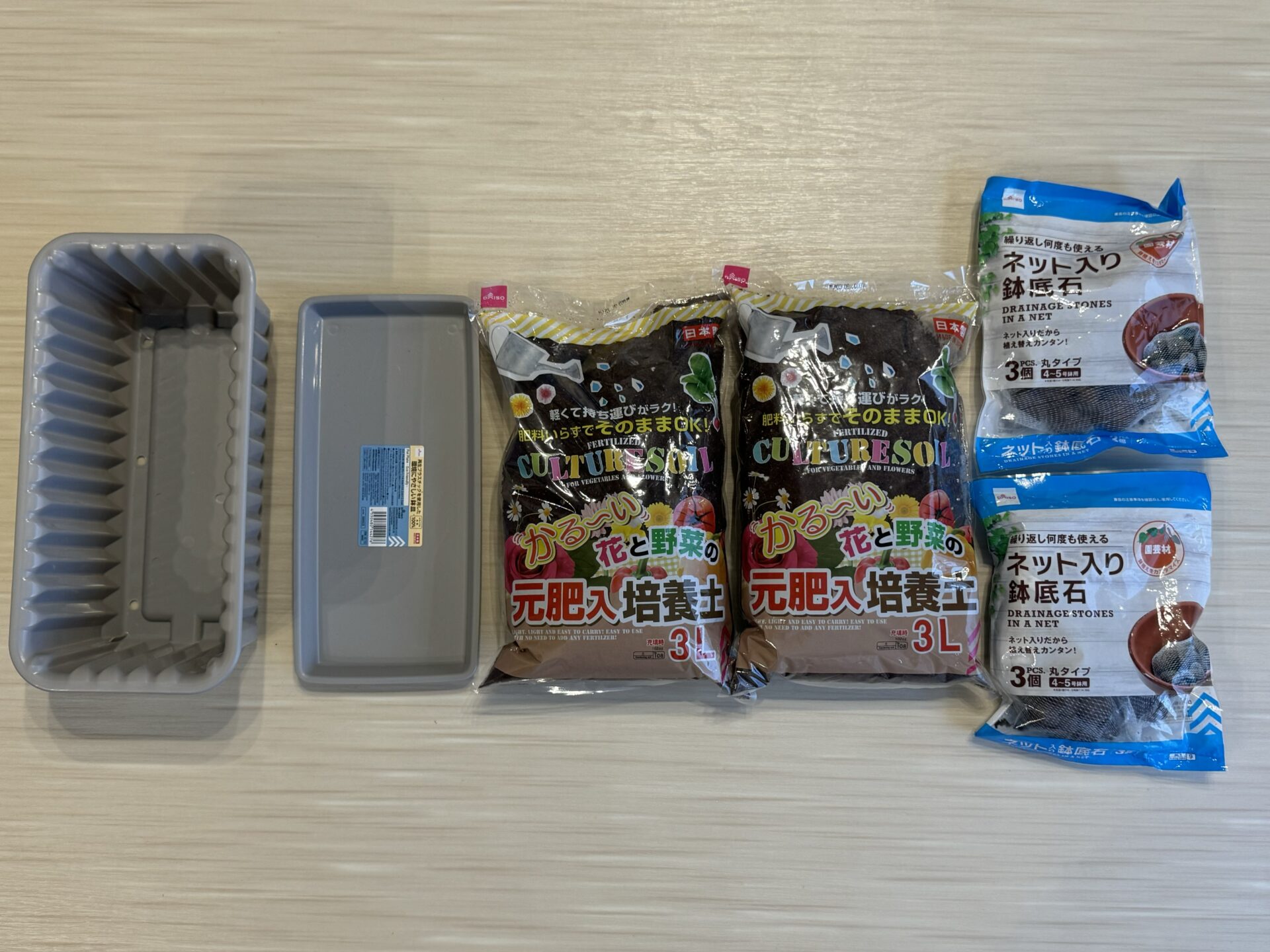 プランターに培養土をちょうど1袋、鉢底石は1袋に3個入りのものを4個使いました。