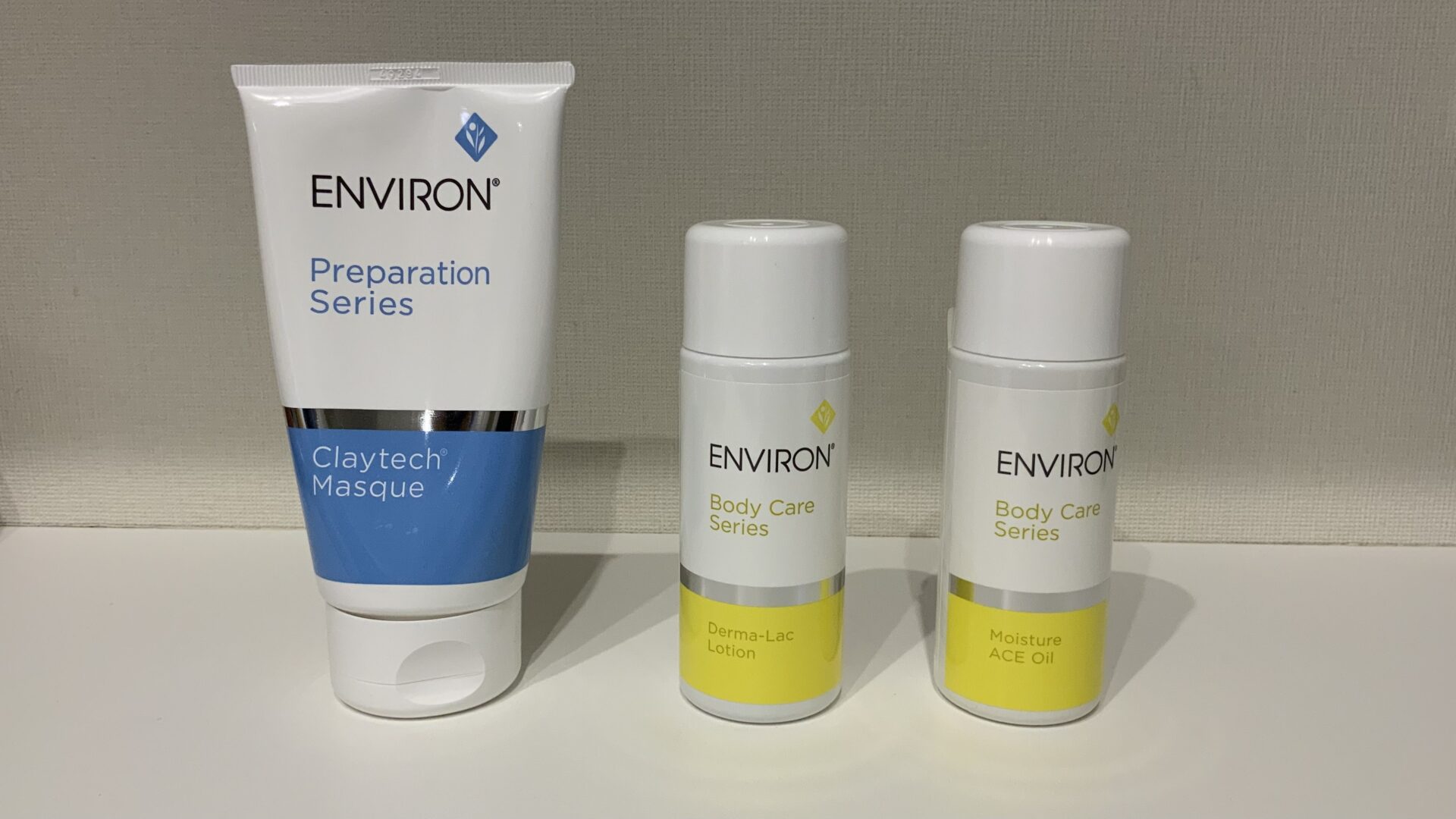 使用するのはENVIRONクレイテックマスク、ダーマラックローション、ACEオイル!
