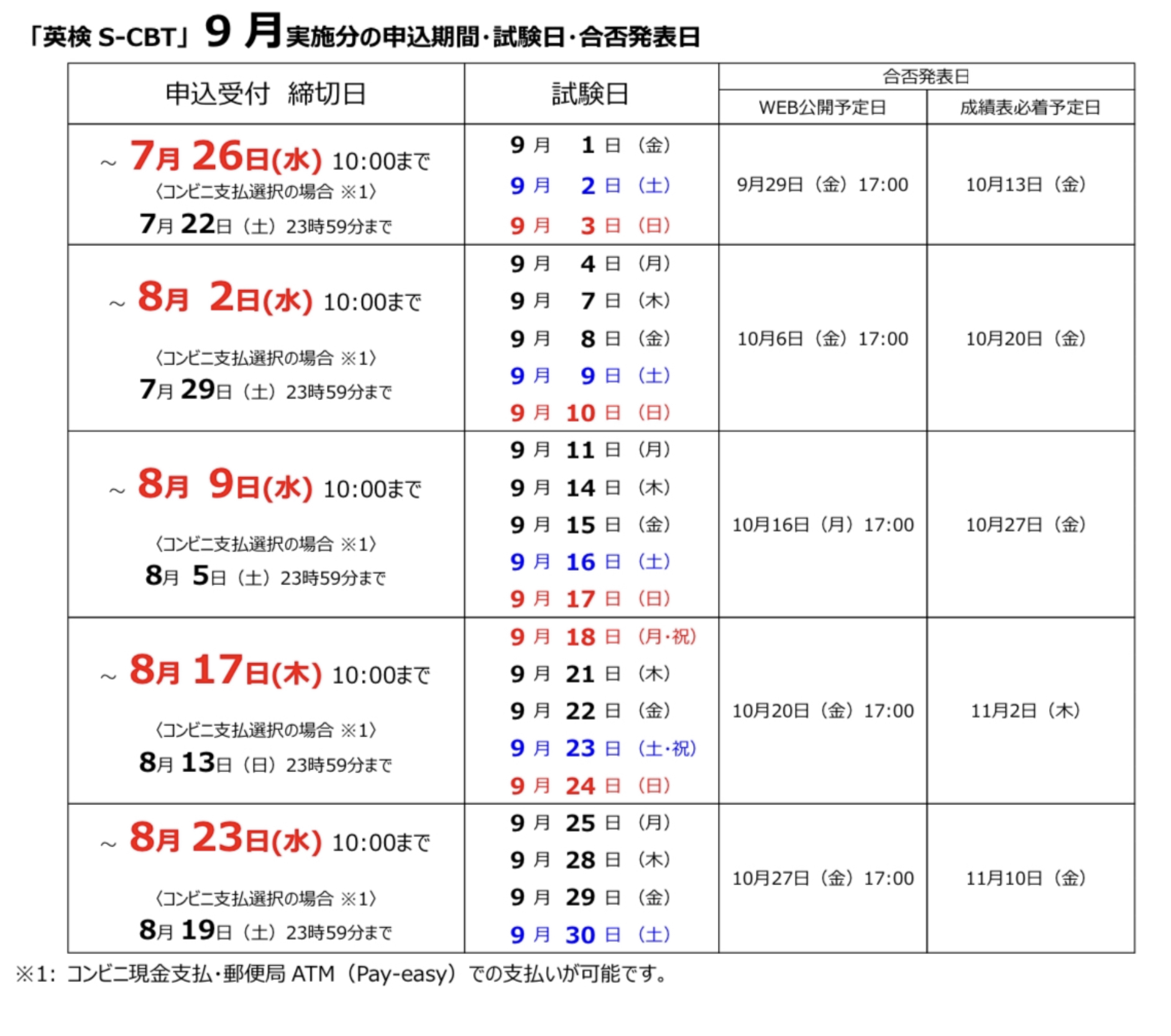 上記の日程全部で準1級が受験できるわけではないので、