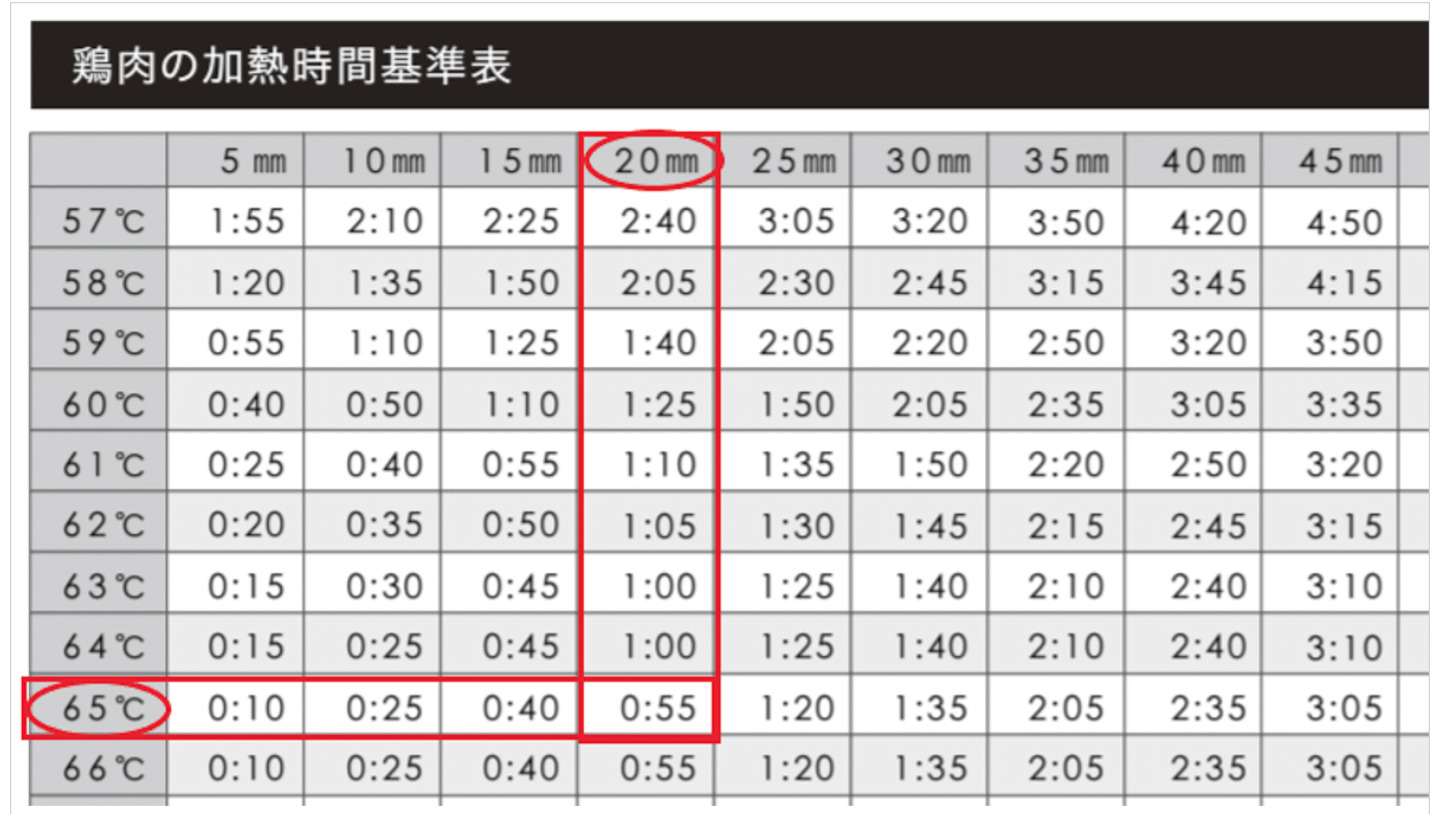BONIQには”低温調理 加熱時間基準表”が付属しています。